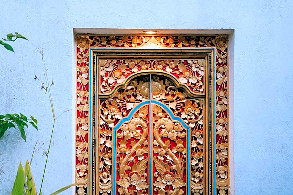 Featuring traditional Balinese doors, this room has a seating area with beautiful garden view.